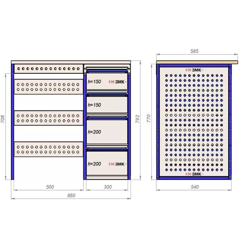 Комплект ЗМК 13.57.792.860.585 предназначен для комплексного оснащения сервисных автомобилей системой хранения инструмента с целью осуществления выездного сервиса, монтажа или ремонта. Используется в организациях, занимающихся ремонтом сельскохозяйственной и погрузочной техники, дорожно-ремонтных служб и других. Все элементы стеллажей изготовлены из высококачественной стали толщиной 1 мм. Рамы из профильной стальной трубы квадратного сечения 20х20 мм имеют порошковое полимерное покрытие синего цвета. Все выдвижные ящики, дверные блоки и откидные крышки оснащены специальными фиксаторами, которые не позволяют им выдвигаться и открываться при движении автомобиля. Шаг отверстий для крепления составляет 52 мм. Перфорированные стенки стеллажа позволяют фиксировать с помощью резиновых креплений вспомогательный инструмент или оборудование. Допустимая нагрузка на все ящики до 35 кг, на все полки до 50 кг, на столешницы до 100 кг. В комплект стеллажа входят все необходимые метизы, фиксаторы, кронштейны и усилители. Они поставляются в разобранном виде в надежной упаковке.