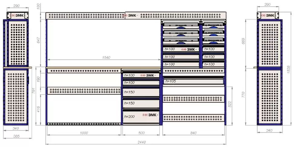 Комплект ЗМК 3.11.1538.2440.385 предназначен для комплексного оснащения сервисных автомобилей системой хранения инструмента с целью осуществления выездного сервиса, монтажа или ремонта. Используется в организациях, занимающихся ремонтом сельскохозяйственной и погрузочной техники, дорожно-ремонтных служб и других. Все элементы стеллажей изготовлены из высококачественной стали толщиной 1 мм. Рамы из профильной стальной трубы квадратного сечения 20х20 мм имеют порошковое полимерное покрытие синего цвета. Все выдвижные ящики, дверные блоки и откидные крышки оснащены специальными фиксаторами, которые не позволяют им выдвигаться и открываться при движении автомобиля. Шаг отверстий для крепления составляет 52 мм. Перфорированные стенки стеллажа позволяют фиксировать с помощью резиновых креплений вспомогательный инструмент или оборудование. Допустимая нагрузка на все ящики до 15 кг, на все полки до 50 кг, на столешницы до 100 кг. В комплект стеллажа входят все необходимые метизы, фиксаторы, кронштейны и усилители. Они поставляются в разобранном виде в надежной упаковке.