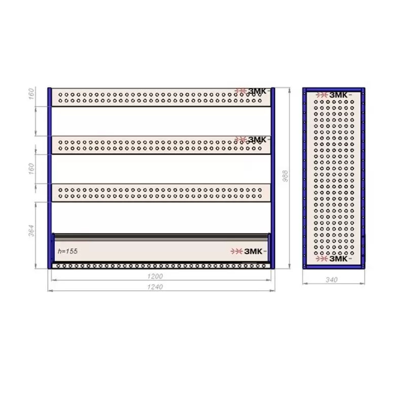 Комплект ЗМК 4.1.988.1240.340 предназначен для комплексного оснащения сервисных автомобилей системой хранения инструмента с целью осуществления выездного сервиса, монтажа или ремонта. Используется в организациях, занимающихся ремонтом сельскохозяйственной и погрузочной техники, дорожно-ремонтных служб и других. Все элементы стеллажей изготовлены из высококачественной стали толщиной 1 мм. Рамы из профильной стальной трубы квадратного сечения 20х20 мм имеют порошковое полимерное покрытие синего цвета. Все выдвижные ящики, дверные блоки и откидные крышки оснащены специальными фиксаторами, которые не позволяют им выдвигаться и открываться при движении автомобиля. Шаг отверстий для крепления составляет 52 мм. Перфорированные стенки стеллажа позволяют фиксировать с помощью резиновых креплений вспомогательный инструмент или оборудование. Допустимая нагрузка на все ящики до 35 кг, на все полки до 50 кг, на столешницы до 100 кг. В комплект стеллажа входят все необходимые метизы, фиксаторы, кронштейны и усилители. Они поставляются в разобранном виде в надежной упаковке.