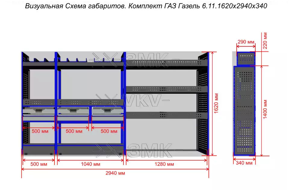 Комплект ЗМК 6.11.1620.2940.340 предназначен для комплексного оснащения сервисных автомобилей системой хранения инструмента с целью осуществления выездного сервиса, монтажа или ремонта. Используется в организациях, занимающихся ремонтом сельскохозяйственной и погрузочной техники, дорожно-ремонтных служб и других. Все элементы стеллажей изготовлены из высококачественной стали толщиной 1 мм. Рамы из профильной стальной трубы квадратного сечения 20х20 мм имеют порошковое полимерное покрытие синего цвета. Все выдвижные ящики, дверные блоки и откидные крышки оснащены специальными фиксаторами, которые не позволяют им выдвигаться и открываться при движении автомобиля. Шаг отверстий для крепления составляет 52 мм. Перфорированные стенки стеллажа позволяют фиксировать с помощью резиновых креплений вспомогательный инструмент или оборудование. Допустимая нагрузка на все ящики до 35 кг, на все полки до 50 кг, на столешницы до 100 кг. В комплект стеллажа входят все необходимые метизы, фиксаторы, кронштейны и усилители. Они поставляются в разобранном виде в надежной упаковке.