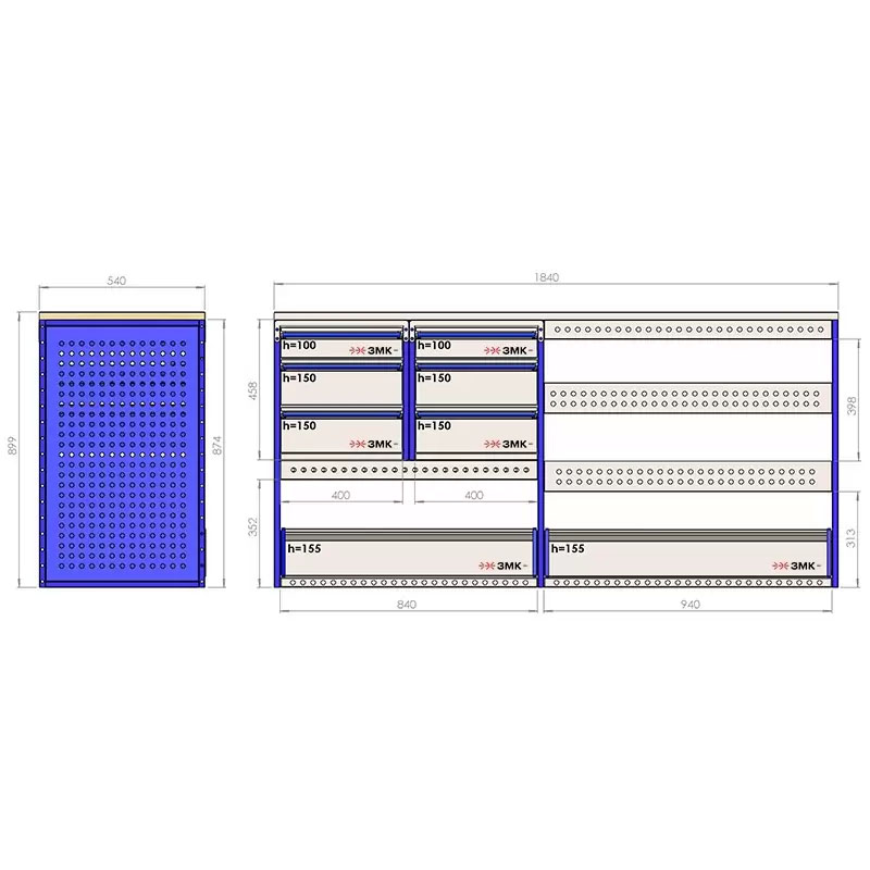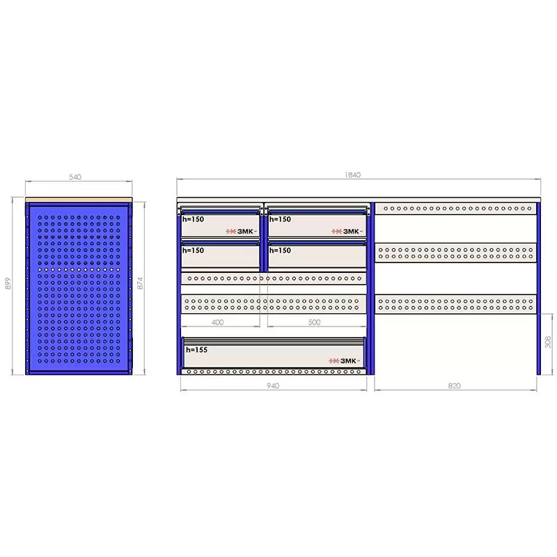 Комплект ЗМК 6.12.1600.3040.540 предназначен для комплексного оснащения сервисных автомобилей системой хранения инструмента с целью осуществления выездного сервиса, монтажа или ремонта. Используется в организациях, занимающихся ремонтом сельскохозяйственной и погрузочной техники, дорожно-ремонтных служб и других. Все элементы стеллажей изготовлены из высококачественной стали толщиной 1 мм. Рамы из профильной стальной трубы квадратного сечения 20х20 мм имеют порошковое полимерное покрытие синего цвета. Все выдвижные ящики, дверные блоки и откидные крышки оснащены специальными фиксаторами, которые не позволяют им выдвигаться и открываться при движении автомобиля. Шаг отверстий для крепления составляет 52 мм. Перфорированные стенки стеллажа позволяют фиксировать с помощью резиновых креплений вспомогательный инструмент или оборудование. Допустимая нагрузка на все ящики до 35 кг, на все полки до 50 кг, на столешницы до 100 кг. В комплект стеллажа входят все необходимые метизы, фиксаторы, кронштейны и усилители. Они поставляются в разобранном виде в надежной упаковке.