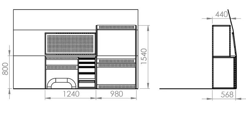 Комплект ЗМК 6.39.1540.2188.568 предназначен для комплексного оснащения сервисных автомобилей системой хранения инструмента с целью осуществления выездного сервиса, монтажа или ремонта. Используется в организациях, занимающихся ремонтом сельскохозяйственной и погрузочной техники, дорожно-ремонтных служб и других. Все элементы стеллажей изготовлены из высококачественной стали толщиной 1 мм. Рамы из профильной стальной трубы квадратного сечения 20х20 мм имеют порошковое полимерное покрытие синего цвета. Все выдвижные ящики, дверные блоки и откидные крышки оснащены специальными фиксаторами, которые не позволяют им выдвигаться и открываться при движении автомобиля. Шаг отверстий для крепления составляет 52 мм. Перфорированные стенки стеллажа позволяют фиксировать с помощью резиновых креплений вспомогательный инструмент или оборудование. Допустимая нагрузка на все ящики до 35 кг, на все полки до 50 кг, на столешницы до 100 кг. В комплект стеллажа входят все необходимые метизы, фиксаторы, кронштейны и усилители. Они поставляются в разобранном виде в надежной упаковке.
