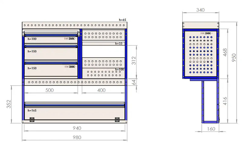 Комплект ЗМК 7.14.950.980.440 предназначен для комплексного оснащения сервисных автомобилей системой хранения инструмента с целью осуществления выездного сервиса, монтажа или ремонта. Используется в организациях, занимающихся ремонтом сельскохозяйственной и погрузочной техники, дорожно-ремонтных служб и других. Все элементы стеллажей изготовлены из высококачественной стали толщиной 1 мм. Рамы из профильной стальной трубы квадратного сечения 20х20 мм имеют порошковое полимерное покрытие синего цвета. Все выдвижные ящики, дверные блоки и откидные крышки оснащены специальными фиксаторами, которые не позволяют им выдвигаться и открываться при движении автомобиля. Шаг отверстий для крепления составляет 52 мм. Перфорированные стенки стеллажа позволяют фиксировать с помощью резиновых креплений вспомогательный инструмент или оборудование. Допустимая нагрузка на все ящики до 35 кг, на все полки до 50 кг, на столешницы до 100 кг. В комплект стеллажа входят все необходимые метизы, фиксаторы, кронштейны и усилители. Они поставляются в разобранном виде в надежной упаковке.