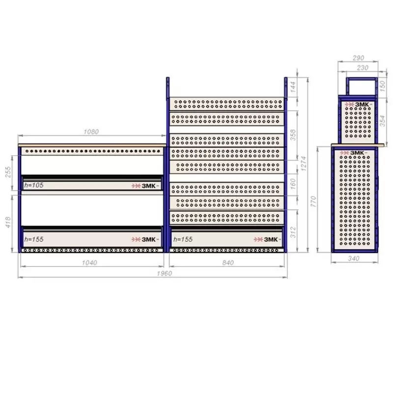 Комплект ЗМК 7.16.1274.1960.385 предназначен для комплексного оснащения сервисных автомобилей системой хранения инструмента с целью осуществления выездного сервиса, монтажа или ремонта. Используется в организациях, занимающихся ремонтом сельскохозяйственной и погрузочной техники, дорожно-ремонтных служб и других. Все элементы стеллажей изготовлены из высококачественной стали толщиной 1 мм. Рамы из профильной стальной трубы квадратного сечения 20х20 мм имеют порошковое полимерное покрытие синего цвета. Все выдвижные ящики, дверные блоки и откидные крышки оснащены специальными фиксаторами, которые не позволяют им выдвигаться и открываться при движении автомобиля. Шаг отверстий для крепления составляет 52 мм. Перфорированные стенки стеллажа позволяют фиксировать с помощью резиновых креплений вспомогательный инструмент или оборудование. Допустимая нагрузка на все ящики до 35 кг, на все полки до 50 кг, на столешницы до 100 кг. В комплект стеллажа входят все необходимые метизы, фиксаторы, кронштейны и усилители. Они поставляются в разобранном виде в надежной упаковке.