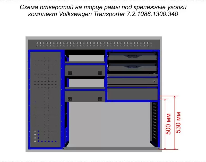 Комплект ЗМК 7.2.1088.1300.340 предназначен для комплексного оснащения сервисных автомобилей системой хранения инструмента с целью осуществления выездного сервиса, монтажа или ремонта. Используется в организациях, занимающихся ремонтом сельскохозяйственной и погрузочной техники, дорожно-ремонтных служб и других. Все элементы стеллажей изготовлены из высококачественной стали толщиной 1 мм. Рамы из профильной стальной трубы квадратного сечения 20х20 мм имеют порошковое полимерное покрытие синего цвета. Все выдвижные ящики, дверные блоки и откидные крышки оснащены специальными фиксаторами, которые не позволяют им выдвигаться и открываться при движении автомобиля. Шаг отверстий для крепления составляет 52 мм. Перфорированные стенки стеллажа позволяют фиксировать с помощью резиновых креплений вспомогательный инструмент или оборудование. Допустимая нагрузка на все ящики до 35 кг, на все полки до 50 кг, на столешницы до 100 кг. В комплект стеллажа входят все необходимые метизы, фиксаторы, кронштейны и усилители. Они поставляются в разобранном виде в надежной упаковке.