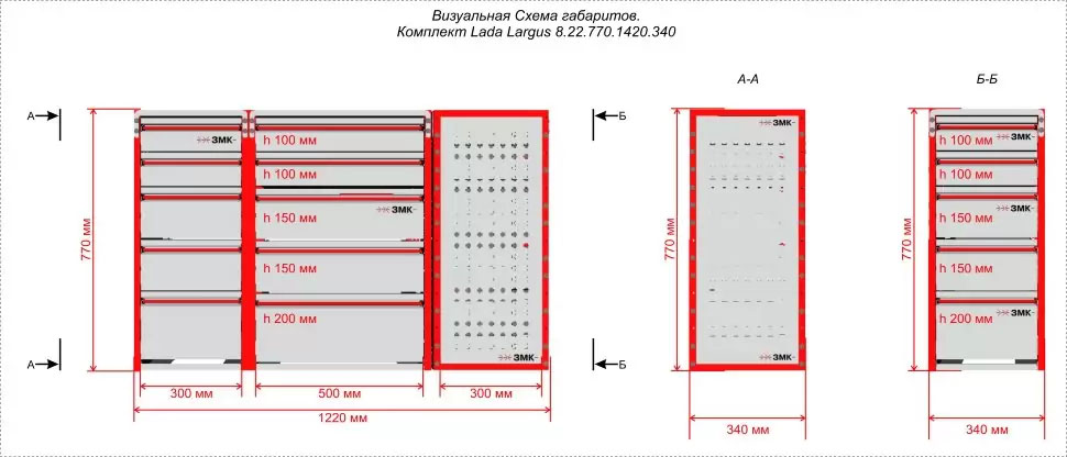 Комплект ЗМК 8.22.770.1420.340 предназначен для комплексного оснащения сервисных автомобилей системой хранения инструмента с целью осуществления выездного сервиса, монтажа или ремонта. Используется в организациях, занимающихся ремонтом сельскохозяйственной и погрузочной техники, дорожно-ремонтных служб и других. Все элементы стеллажей изготовлены из высококачественной стали толщиной 1 мм. Рамы из профильной стальной трубы квадратного сечения 20х20 мм имеют порошковое полимерное покрытие синего цвета. Все выдвижные ящики, дверные блоки и откидные крышки оснащены специальными фиксаторами, которые не позволяют им выдвигаться и открываться при движении автомобиля. Шаг отверстий для крепления составляет 52 мм. Перфорированные стенки стеллажа позволяют фиксировать с помощью резиновых креплений вспомогательный инструмент или оборудование. Допустимая нагрузка на все ящики до 35 кг, на все полки до 50 кг, на столешницы до 100 кг. В комплект стеллажа входят все необходимые метизы, фиксаторы, кронштейны и усилители. Они поставляются в разобранном виде в надежной упаковке.